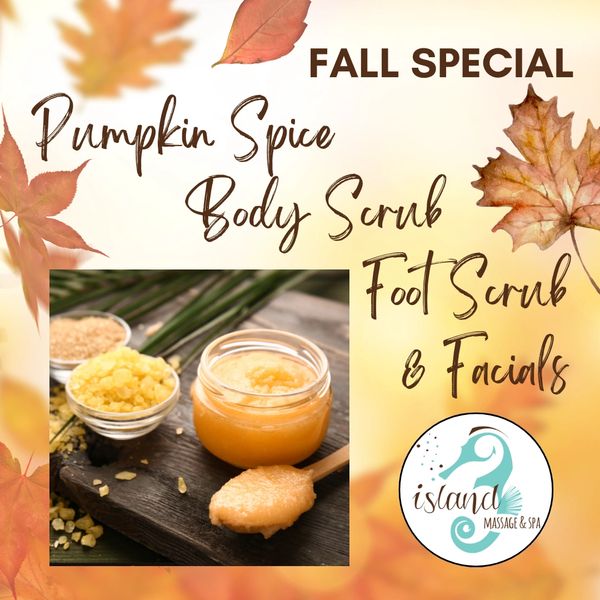 Fall Special: Book a Pumpkin Spice Body Scrub, Foot Scrub, or a Facial. While supplies last!